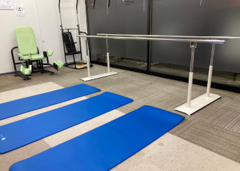 個人の目標に合わせたグループで、床マットやバランスクッション、平行棒などを使用した運動を行います。